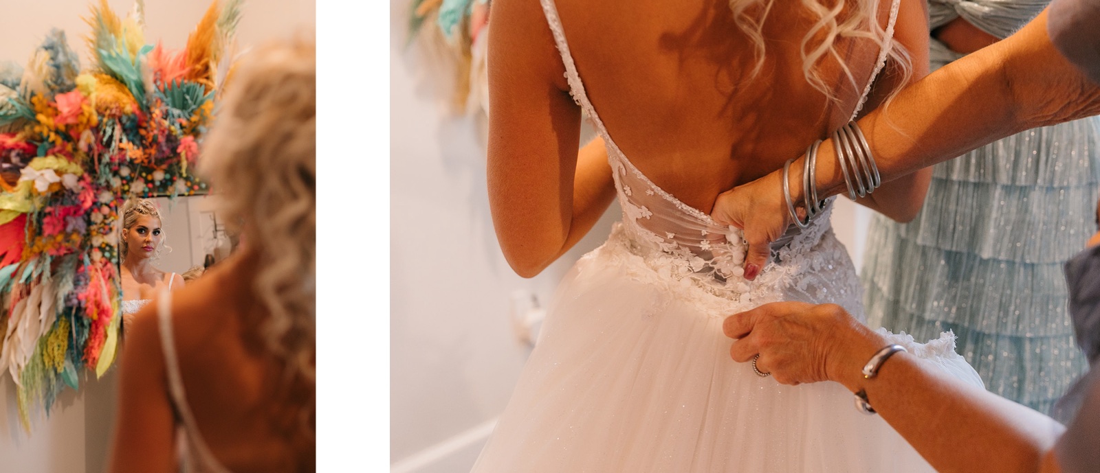 On the morning of the wedding, the bride got ready inside her childhood farmhouse, surrounded by her mom and closest friends. There was no wedding suite or hotel—it was real, cozy, and familiar. Hair was styled by Jessica McNabb, and makeup was handled by Ciara Faulkner, who created a natural, glowy look that held up through an entire day of outdoor celebration.