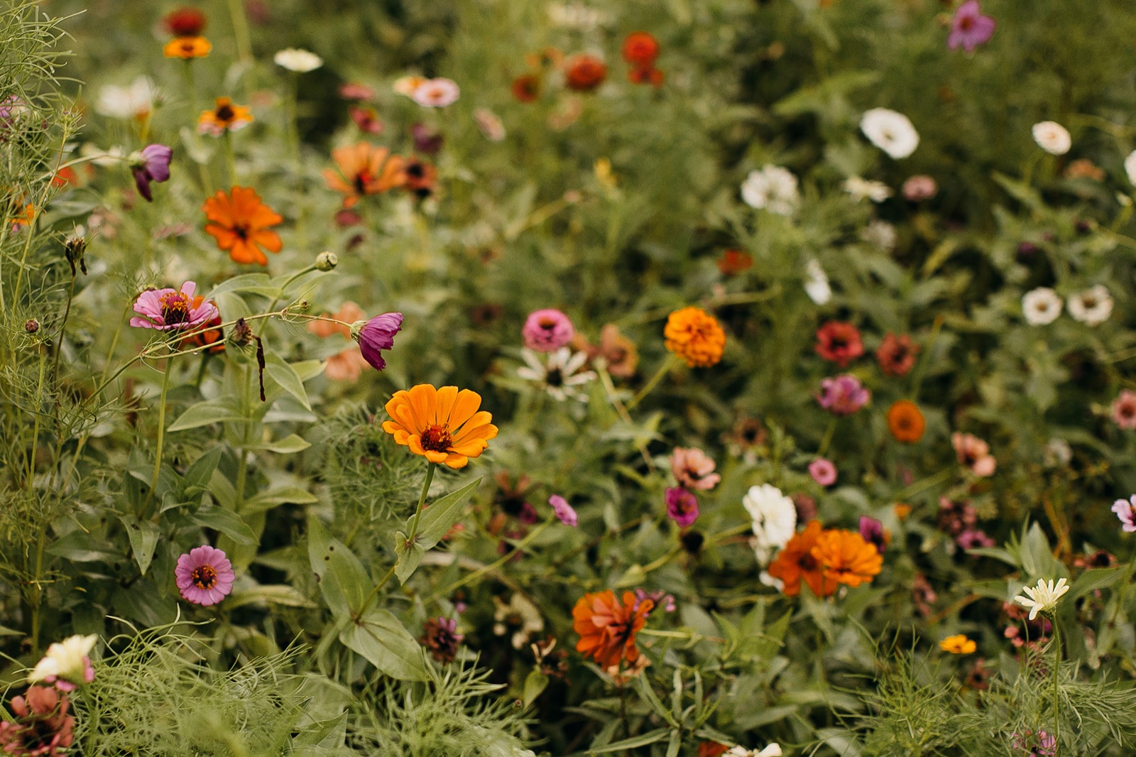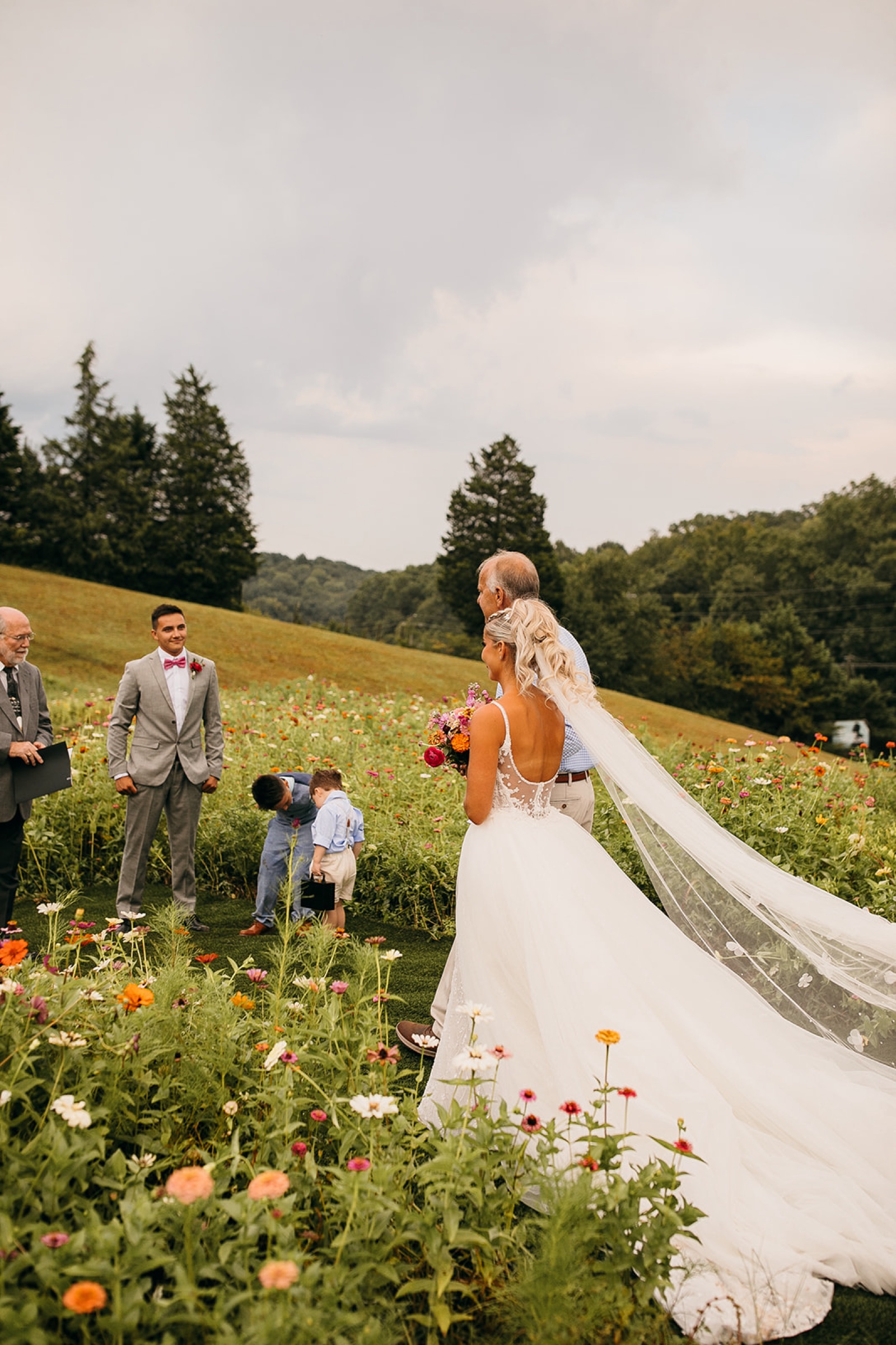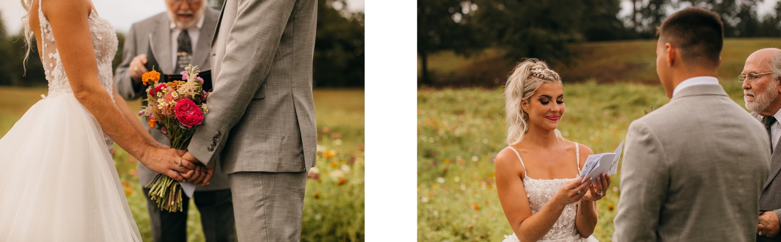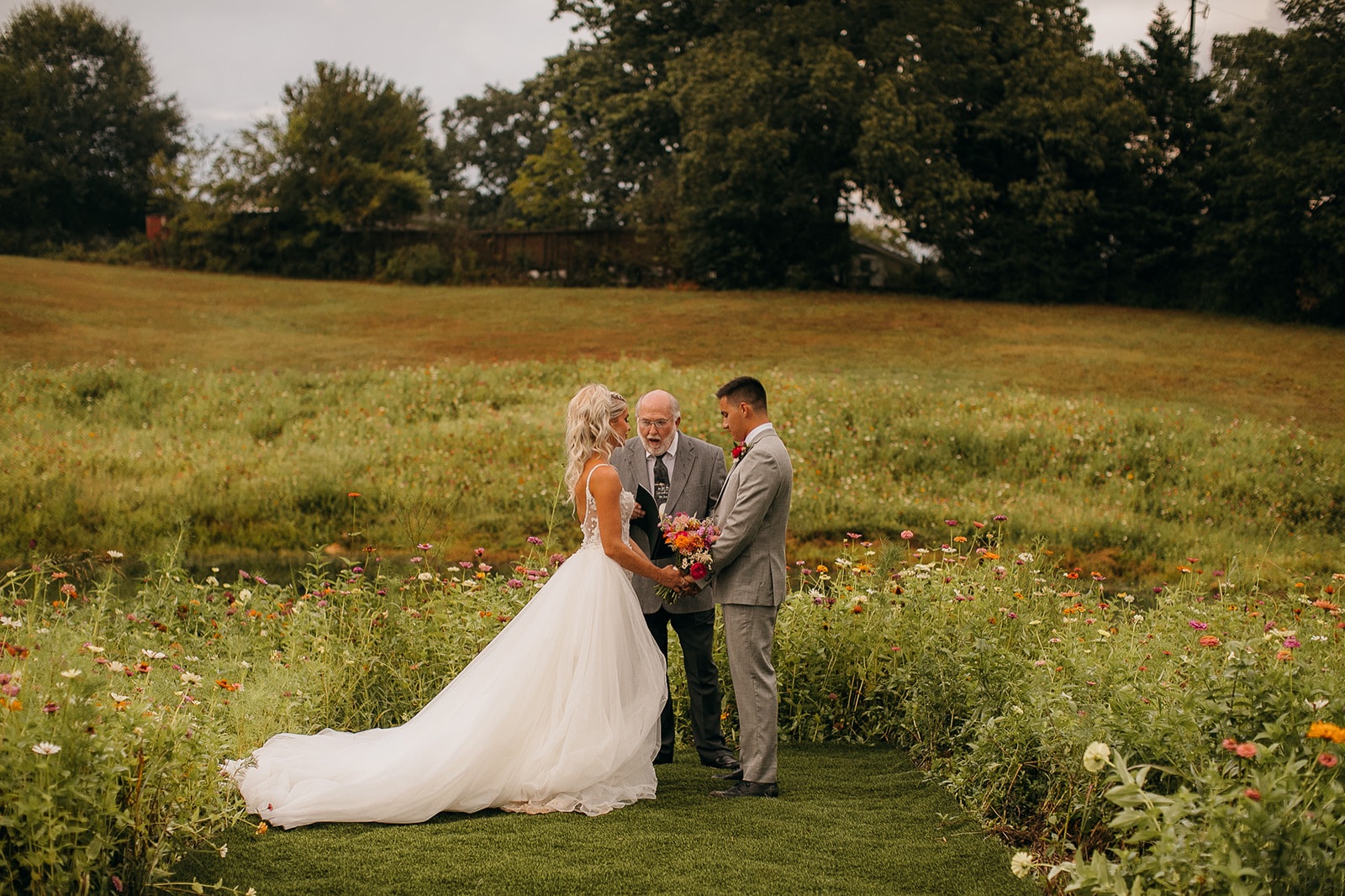 The ceremony was held in the middle of a flower field planted by the couple just for the occasion. With help from local floral designer Fox & Fern, the field was filled with zinnias, cosmos, sunflowers, and native greenery. It created a colorful, living aisle that didn’t need much decorating.