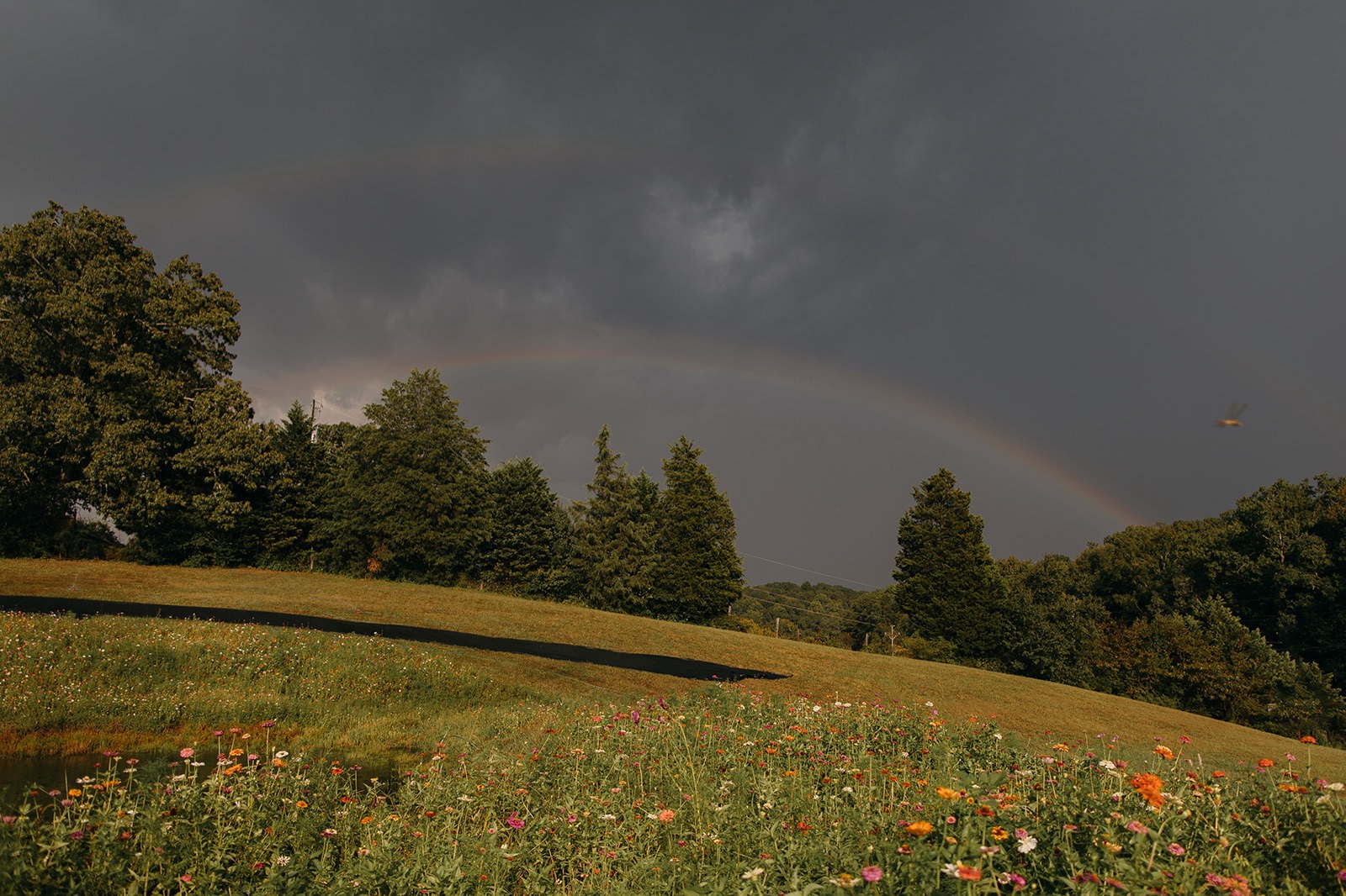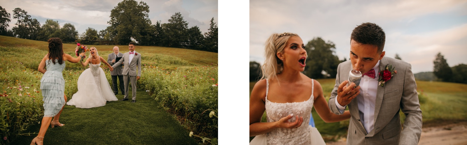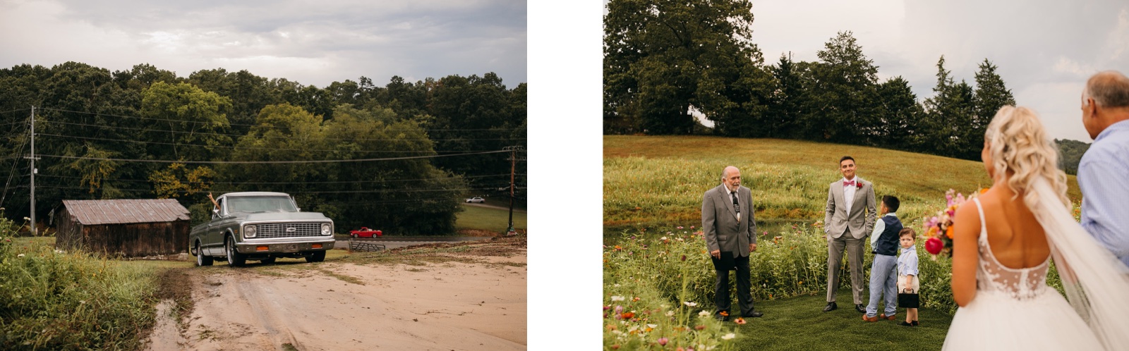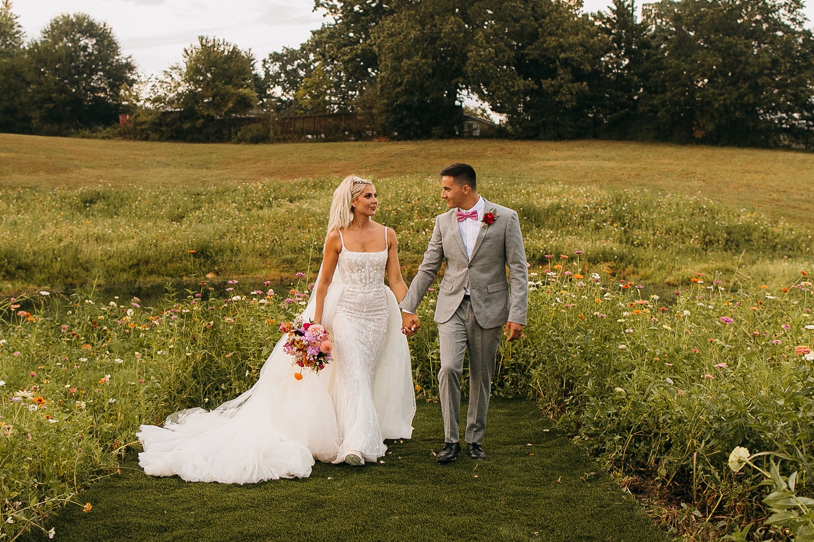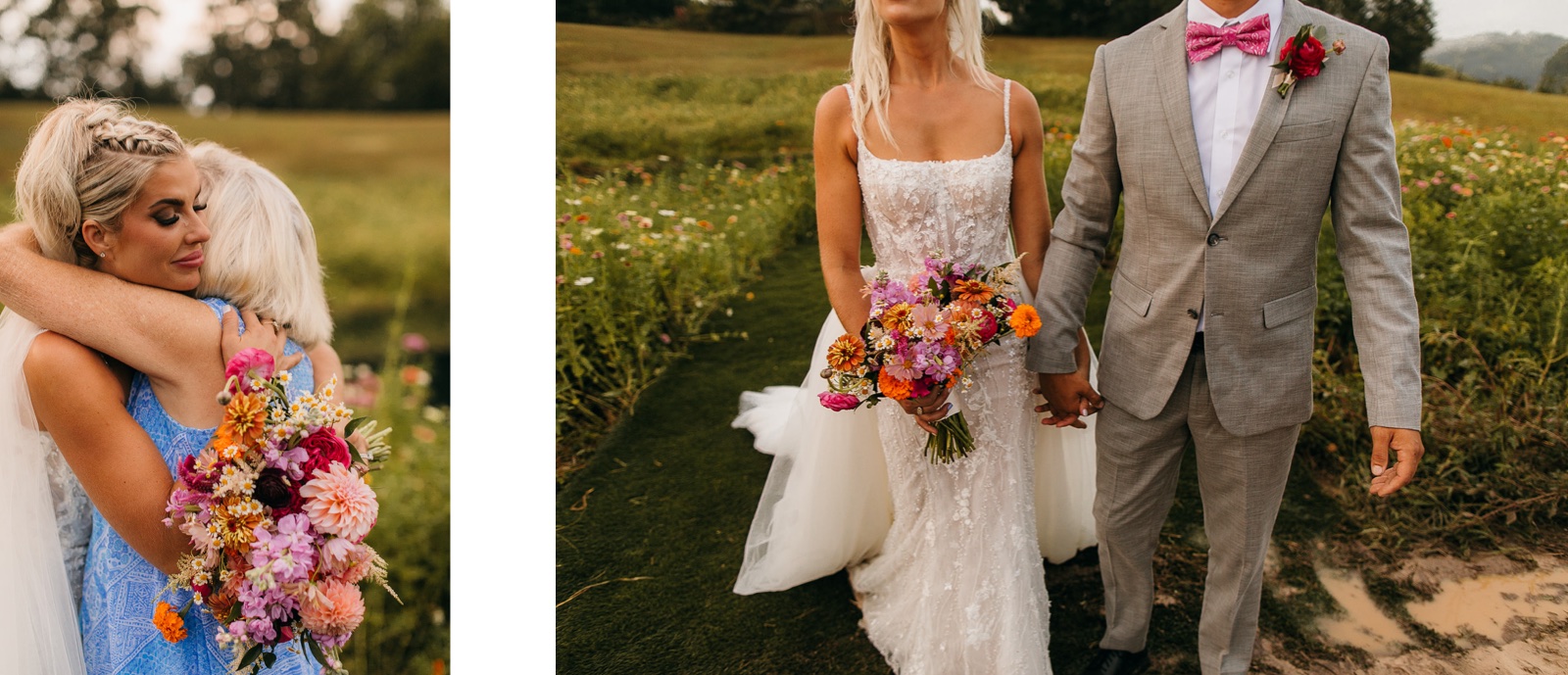 The ceremony was held in the middle of a flower field planted by the couple just for the occasion. With help from local floral designer Fox & Fern, the field was filled with zinnias, cosmos, sunflowers, and native greenery. It created a colorful, living aisle that didn’t need much decorating.