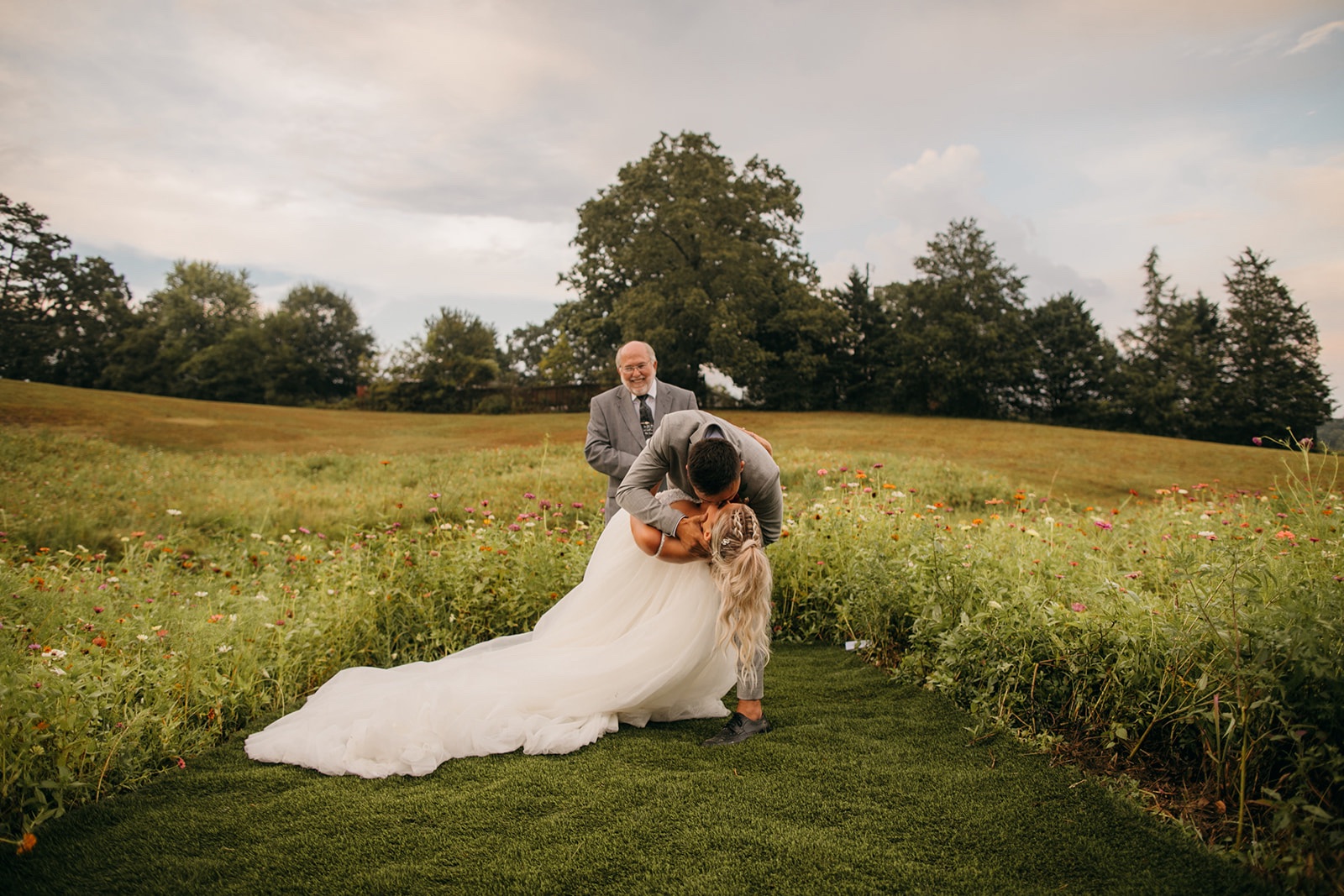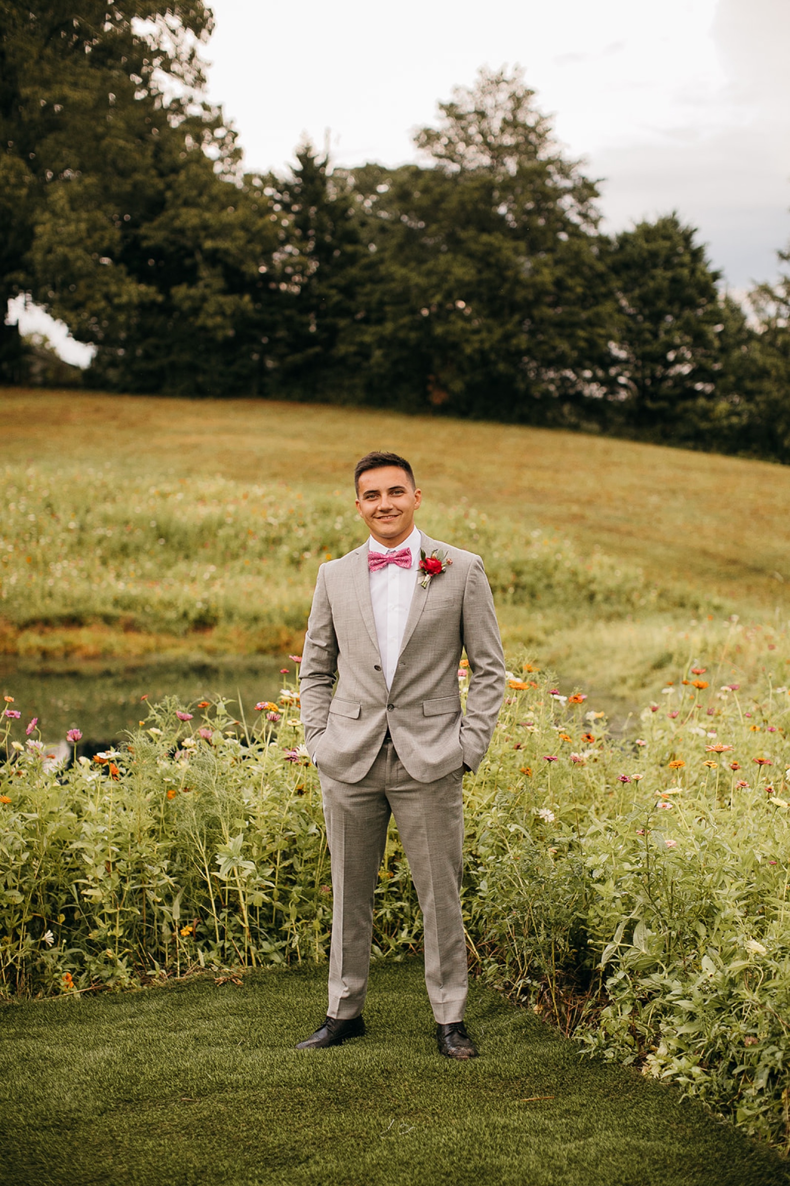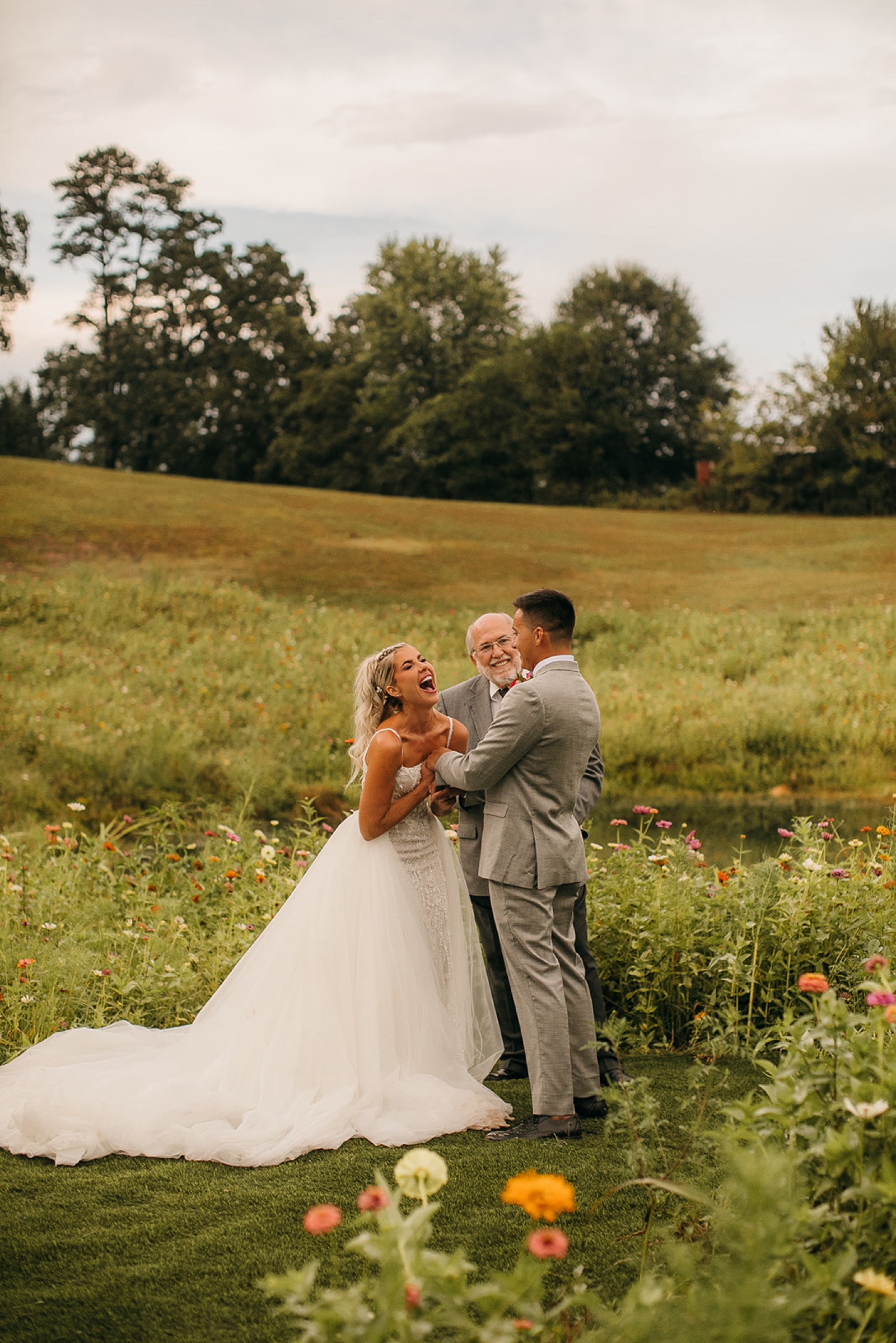 The bride wore a Martina Liana gown—lace with subtle detailing and structure—purchased from White Lace and Promises in Knoxville. It was elegant but relaxed, perfect for a flower-field ceremony. Her accessories were simple, and she added fresh blooms from the garden into her hair.