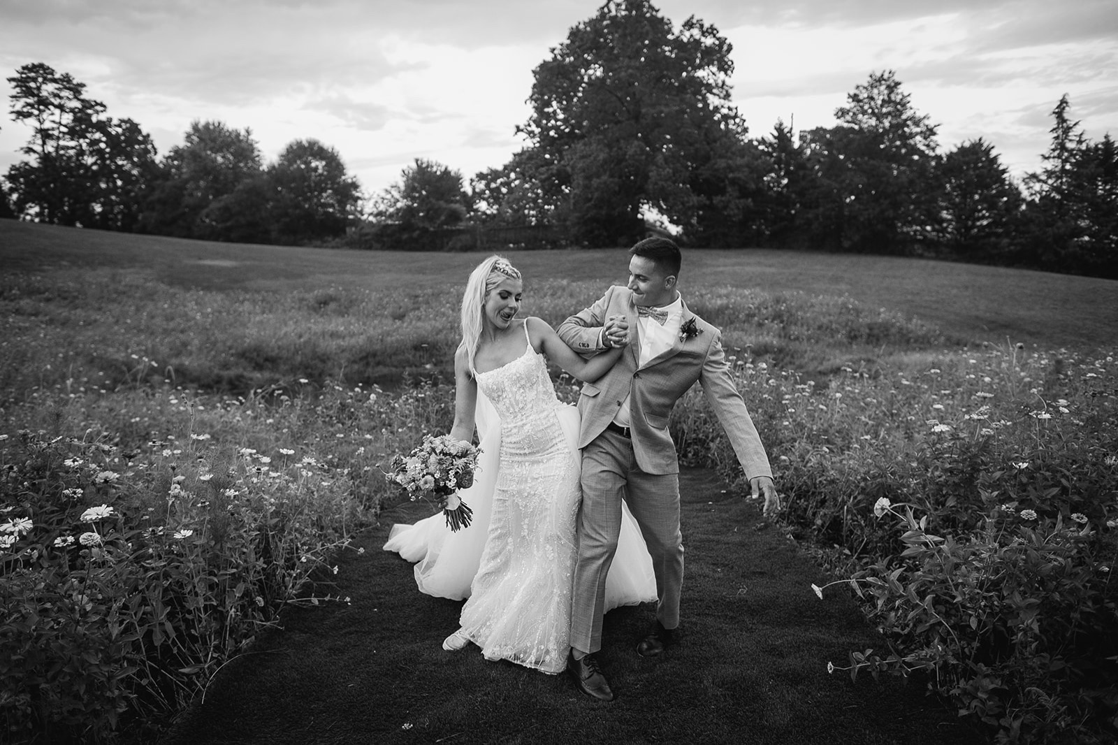 Instead of traditional seating, guests were encouraged to bring picnic blankets and folding chairs. A close friend officiated the ceremony, keeping things personal and light. The vows were handwritten, and the couple’s dog ran freely through the flowers, getting as many smiles as the couple themselves.