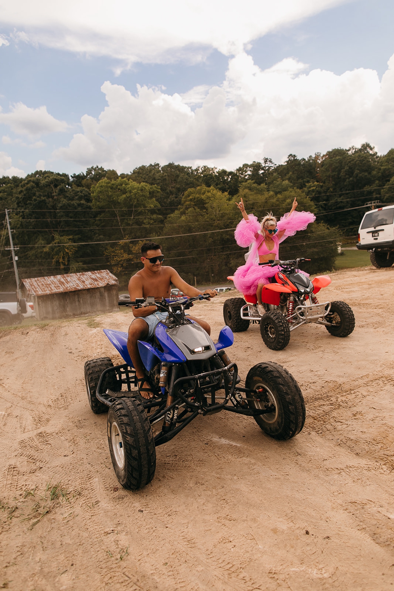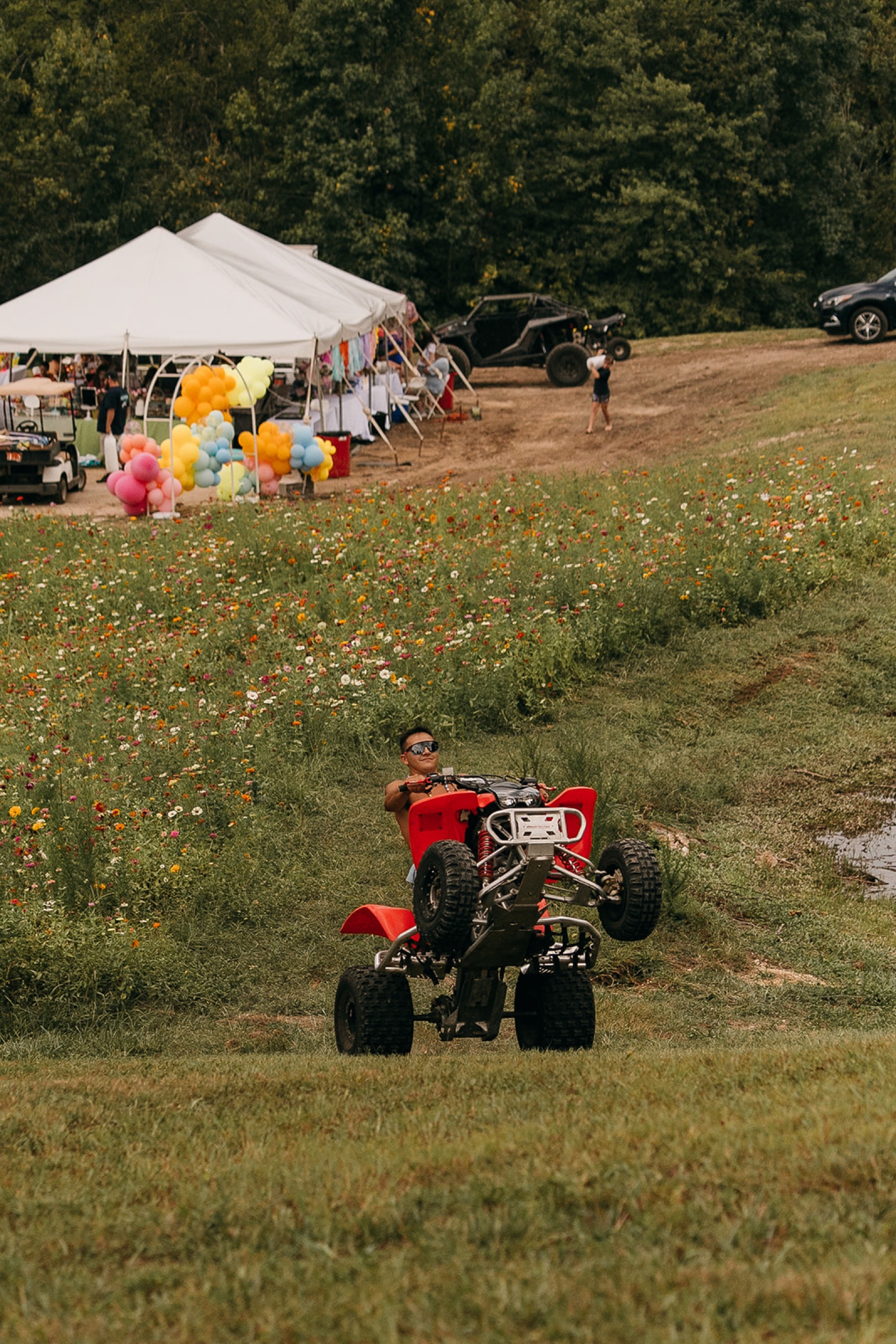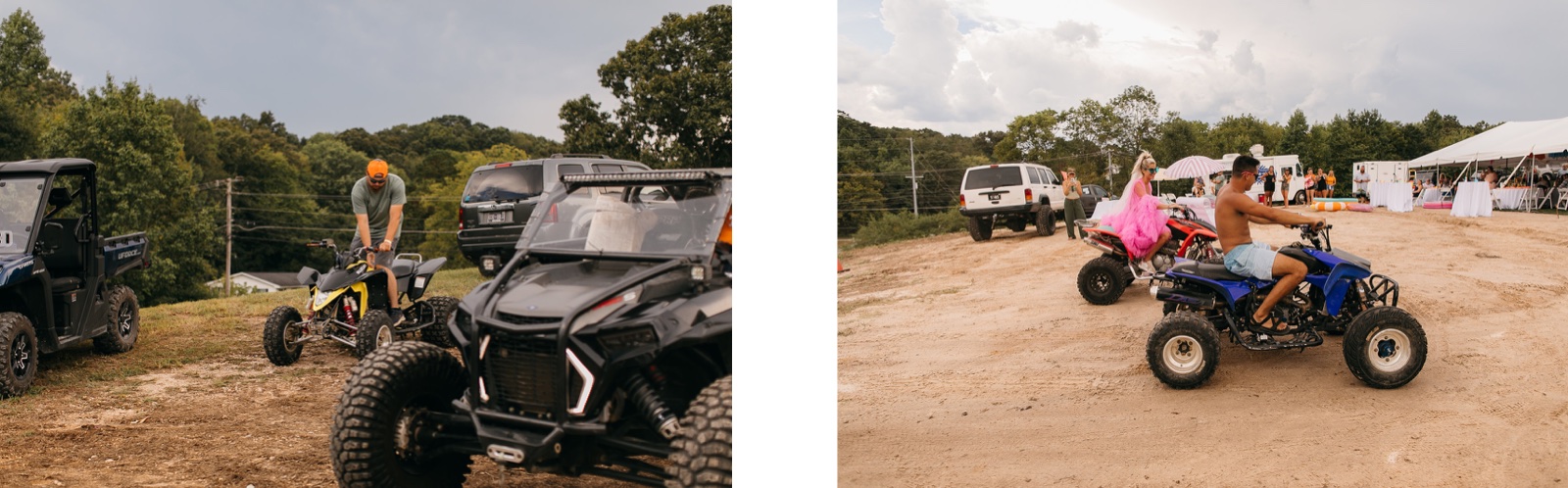 The bride and groom, now in casual clothes and boots, took guests for rides around the property on their 4-wheelers. Laughter echoed through the fields as guests bounced down trails, some holding on for dear life, others raising hands in celebration.