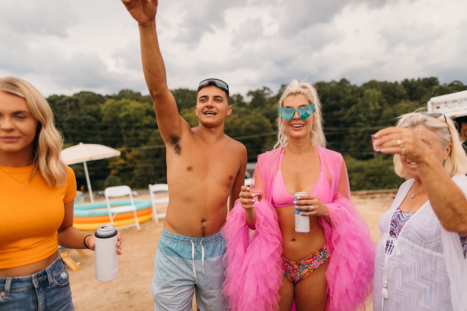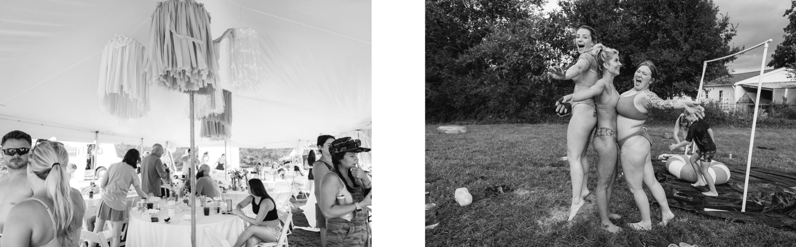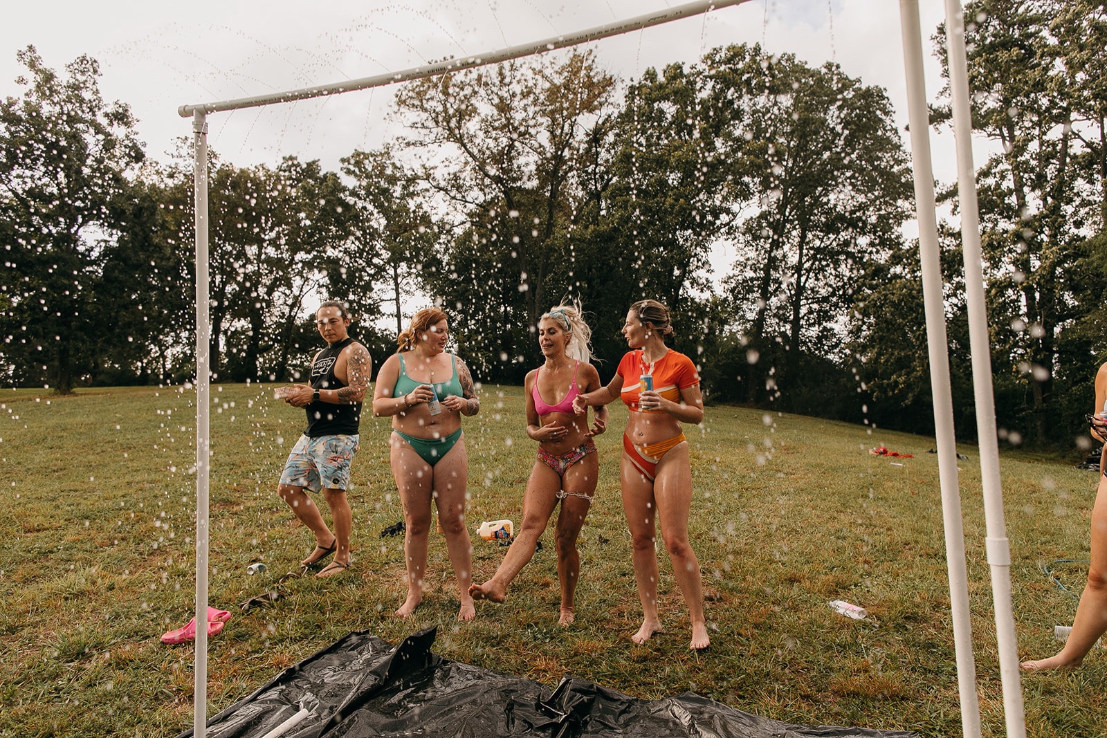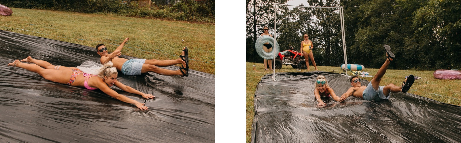Guests took turns sliding down—some in swimsuits, others still in wedding weekend attire. There were water balloons flying, lawn games going, and nonstop music playing from the same well-loved playlist that had powered the night before.